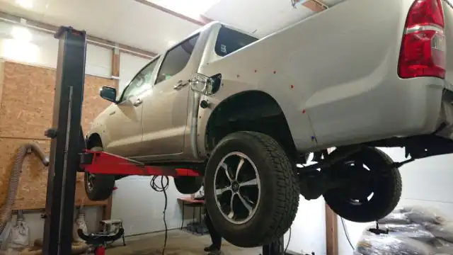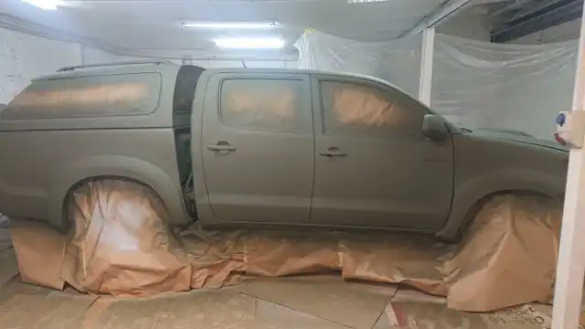 Surowy, cywilny Hilux trafił prosto do warsztatu pod opiekę mechaników Adama Sasa. Sprawa była w sumie dośc prosta. Chciałem, aby mój plan modyfikacji był zbliżony do projektu „Apocalypto” plus parę rzeczy dodatkowych np. blokady dyferencjałów i dodatkowy bak. Zaczęliśmy prace od malowania i konserwacji ramy.